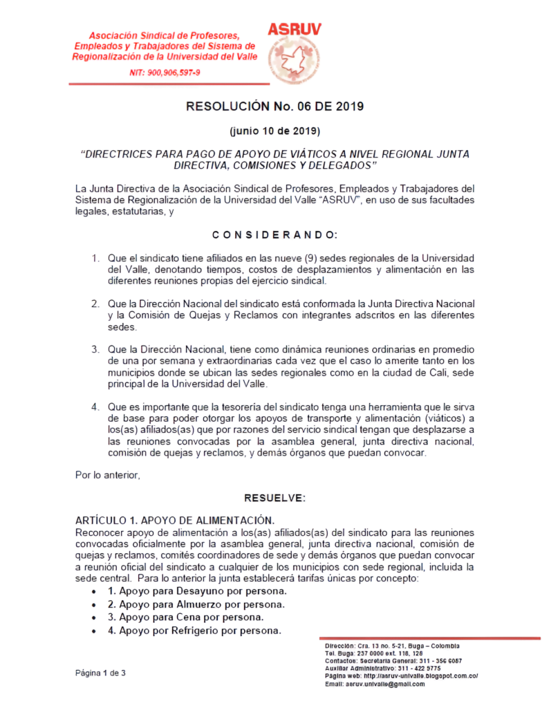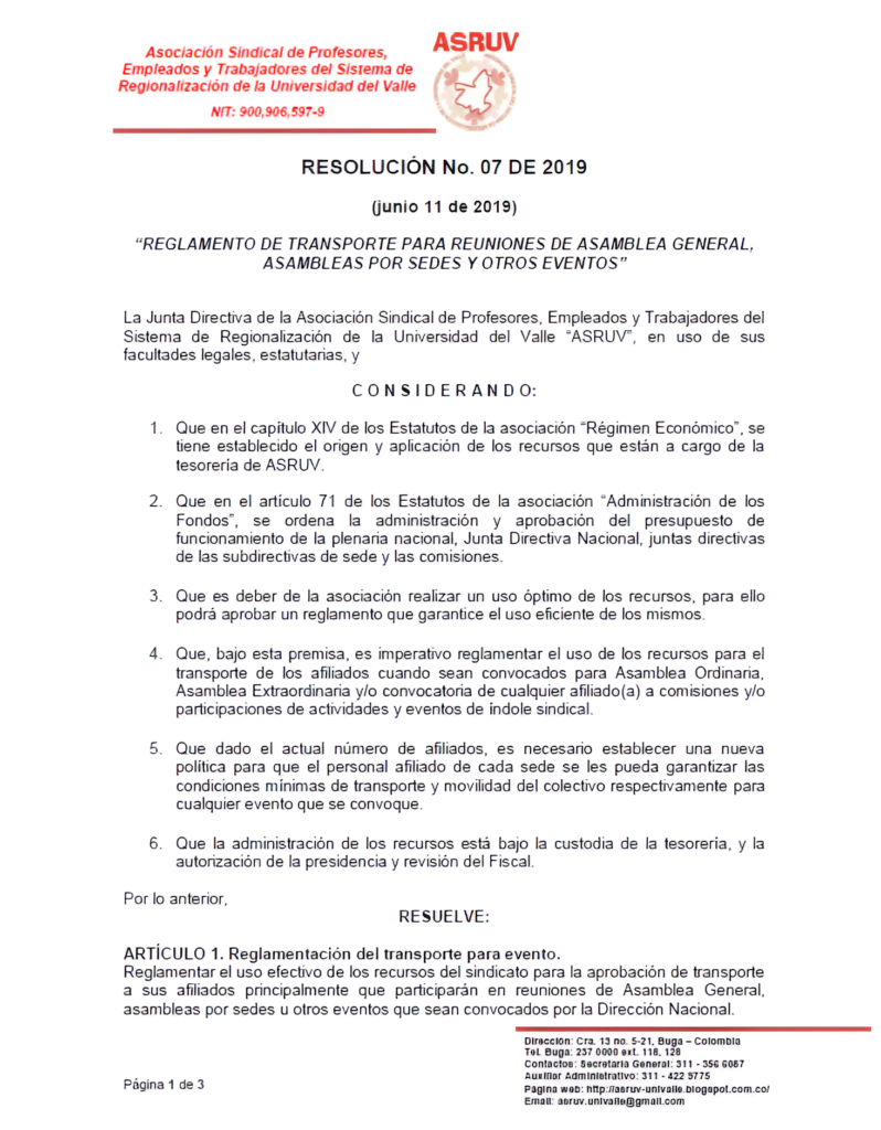Resolución ASRUV-2019-06-11-Reglamento de transporte para reuniones de asamblea general asambleas por sedes y eventos