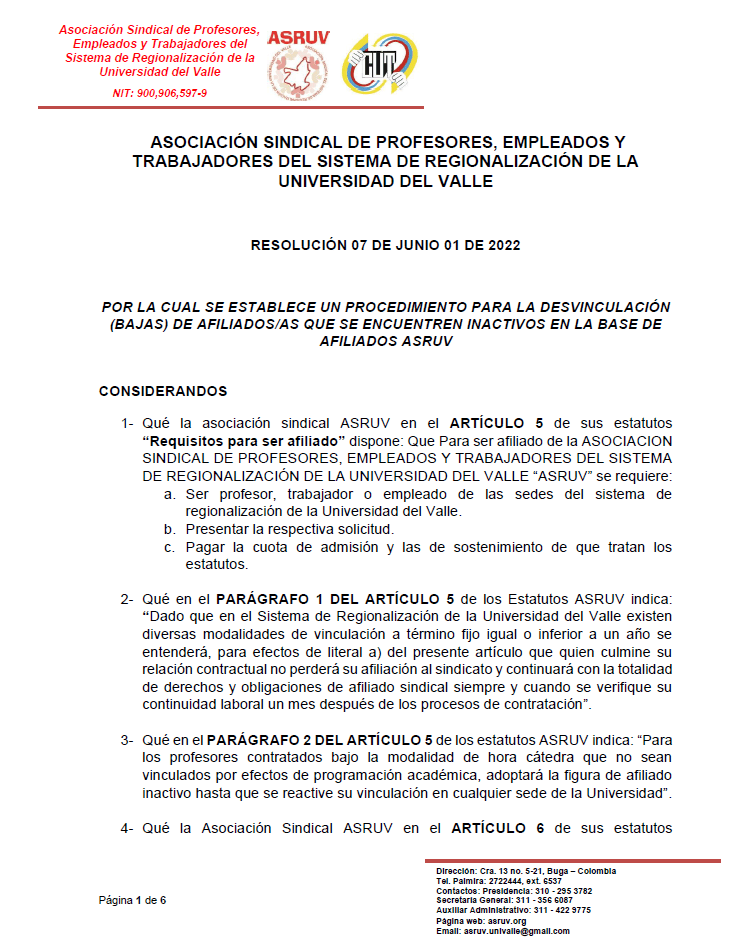 Resolución ASRUV-2022-06-01-POR LA CUAL SE ESTABLECE UN PROCEDIMIENTO PARA LA DESVINCULACION BAJAS DE AFILIADOSAS QUE SE ENCUENTREN INACTIVOS EN LA BASE DE AFILIADOS ASRUV junio 1, 2022