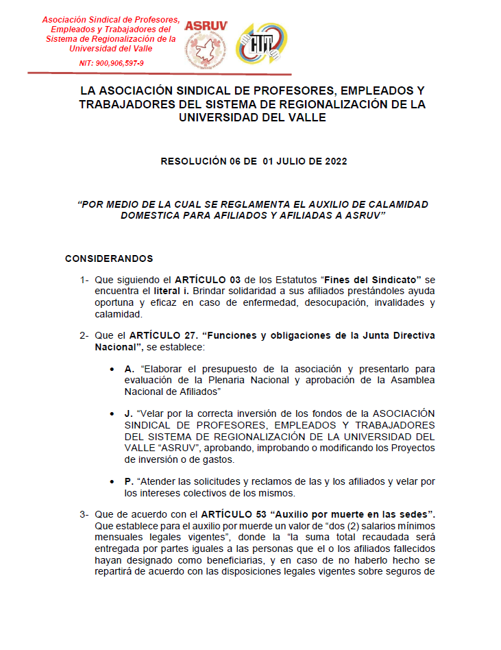 Resolución ASRUV-2022-07-01-POR MEDIO DE LA CUAL SE REGLAMENTA EL AUXILIO DE CALAMIDAD DOMESTICA PARA AFILIADOS Y AFILIADAS A ASRUV julio 1, 2022
