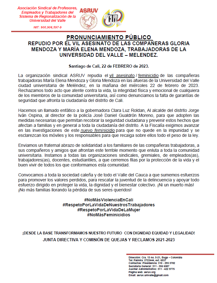 Pronunciamiento público: “REPUDIO A LOS ACTOS DE INTOLERANCIA PERPETRADOS EN CONTRA DE LAS Y LOS ESTUDIANTES DE LA UNIVERSIDAD DEL VALLE EL PASADO LUNES 19 DE MAYO EN LA AVENIDA PASOANCHO” mayo 20, 2025