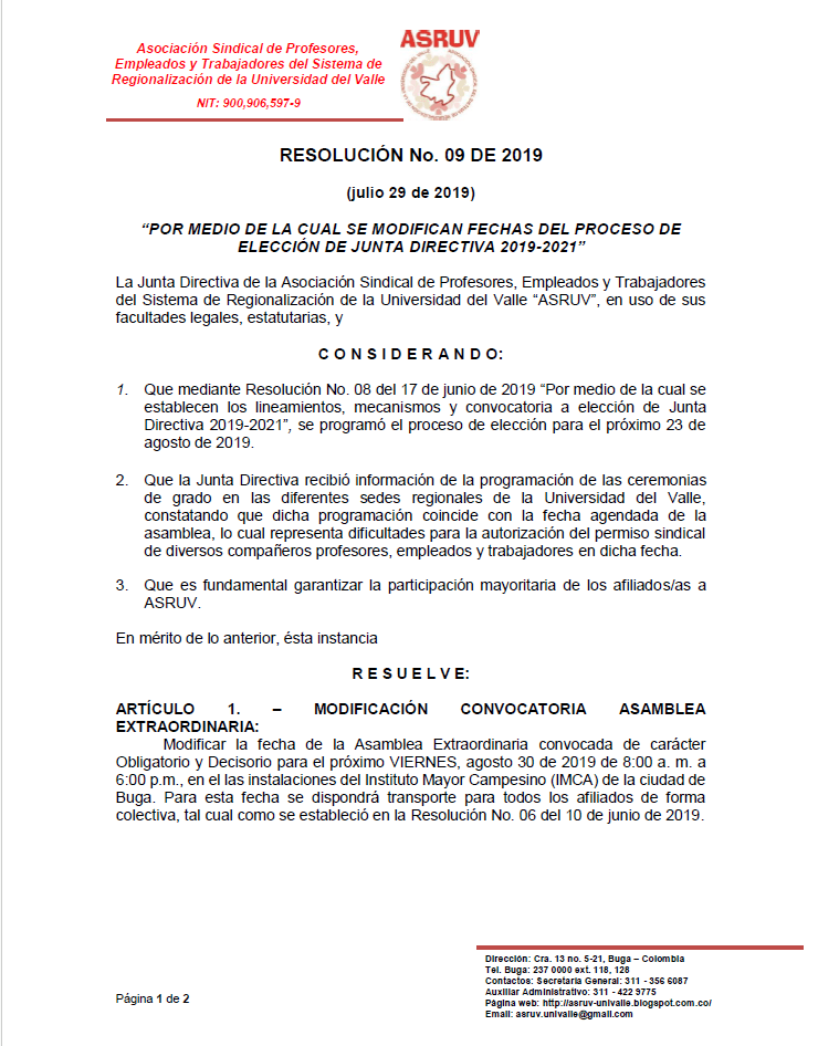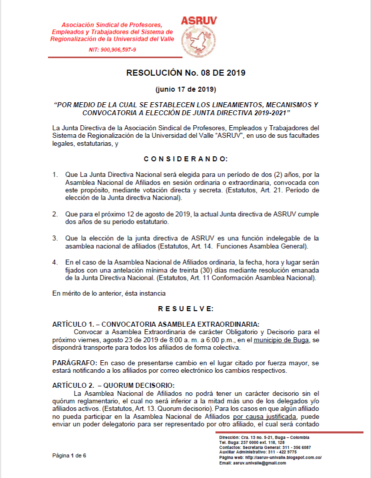 Resolución ASRUV-2019-06-17-Lineamientos mecanismos y convocatoria a elección de junta directiva-2019-2021 junio 17, 2019